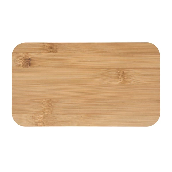 Lunch box zamykany taśmą elastyczną. Wyposażony w widelec, łyżkę, nóż oraz bambusową deseczkę do krojenia.